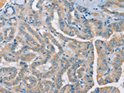 The image on the left is immunohistochemistry of paraffin-embedded Human thyroid cancer tissue using CSB-PA247431(RAD51 Antibody) at dilution 1/25, on the right is treated with synthetic peptide. (Original magnification: ×200)