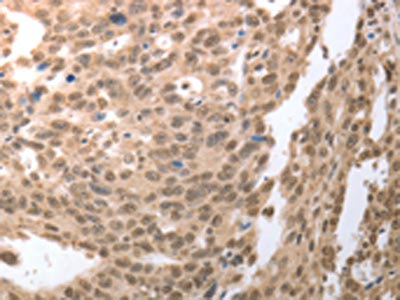 The image on the left is immunohistochemistry of paraffin-embedded Human ovarian cancer using CSB-PA955701(RAD52 Antibody) at dilution 1/50. (Original magnification: ×200)