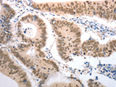 The image is immunohistochemistry of paraffin-embedded Human colon cancer using CSB-PA955701(RAD52 Antibody) at dilution 1/50. (Original magnification: ×200)