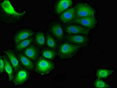 Immunofluorescent analysis of A549 cells using CSB-PA768772LA01HU at dilution of 1:100 and Alexa Fluor 488-congugated AffiniPure Goat Anti-Rabbit IgG(H+L)