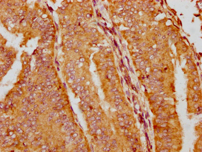IHC image of CSB-PA868376LA01HU diluted at 1:700 and staining in paraffin-embedded human endometrial cancer performed on a Leica BondTM system. After dewaxing and hydration, antigen retrieval was mediated by high pressure in a citrate buffer (pH 6.0). Section was blocked with 10% normal goat serum 30min at RT. Then primary antibody (1% BSA) was incubated at 4°C overnight. The primary is detected by a biotinylated secondary antibody and visualized using an HRP conjugated SP system.