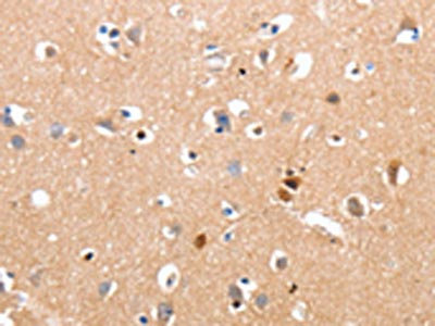 The image on the left is immunohistochemistry of paraffin-embedded Human brain tissue using CSB-PA219431(RALB Antibody) at dilution 1/10, on the right is treated with synthetic peptide. (Original magnification: ×200)