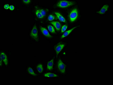 Immunofluorescence staining of A549 cells with CSB-PA019305LA01HU at 1:230, counter-stained with DAPI. The cells were fixed in 4% formaldehyde, permeabilized using 0.2% Triton X-100 and blocked in 10% normal Goat Serum. The cells were then incubated with the antibody overnight at 4°C. The secondary antibody was Alexa Fluor 488-congugated AffiniPure Goat Anti-Rabbit IgG(H+L).