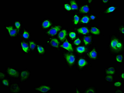 Immunofluorescence staining of Hela cells with CSB-PA897493LA01HU at 1:133, counter-stained with DAPI. The cells were fixed in 4% formaldehyde, permeabilized using 0.2% Triton X-100 and blocked in 10% normal Goat Serum. The cells were then incubated with the antibody overnight at 4°C. The secondary antibody was Alexa Fluor 488-congugated AffiniPure Goat Anti-Rabbit IgG(H+L).