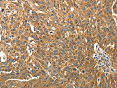 The image on the left is immunohistochemistry of paraffin-embedded Human liver cancer tissue using CSB-PA916321(RARA Antibody) at dilution 1/40, on the right is treated with fusion protein. (Original magnification: ×200)