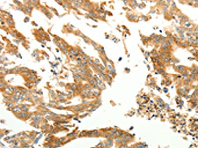 The image on the left is immunohistochemistry of paraffin-embedded Human gastric cancer tissue using CSB-PA843377(RARRES1 Antibody) at dilution 1/60, on the right is treated with synthetic peptide. (Original magnification: ×200)