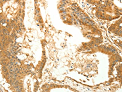 The image on the left is immunohistochemistry of paraffin-embedded Human colon cancer tissue using CSB-PA149671(RARRES1 Antibody) at dilution 1/60, on the right is treated with synthetic peptide. (Original magnification: ×200)