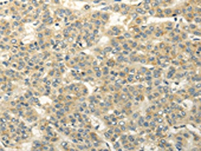 The image on the left is immunohistochemistry of paraffin-embedded Human liver cancer tissue using CSB-PA509583(RASD2 Antibody) at dilution 1/20, on the right is treated with fusion protein. (Original magnification: ×200)