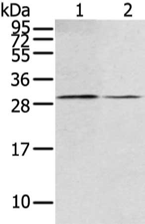 Gel: 12%SDS-PAGE, Lysate: 40 μg, Lane 1-2: Mouse kidney tissue and hela cell, Primary antibody: CSB-PA509583(RASD2 Antibody) at dilution 1/400 dilution, Secondary antibody: Goat anti rabbit IgG at 1/8000 dilution, Exposure time: 10 seconds