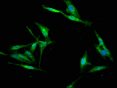 Immunofluorescence staining of Hela cells with CSB-PA019439LA01HU at 1:133, counter-stained with DAPI. The cells were fixed in 4% formaldehyde, permeabilized using 0.2% Triton X-100 and blocked in 10% normal Goat Serum. The cells were then incubated with the antibody overnight at 4°C. The secondary antibody was Alexa Fluor 488-congugated AffiniPure Goat Anti-Rabbit IgG(H+L).