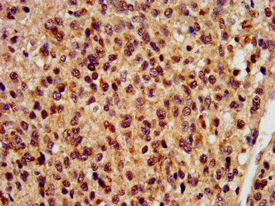 IHC image of CSB-PA019439LA01HU diluted at 1:400 and staining in paraffin-embedded human glioma performed on a Leica BondTM system. After dewaxing and hydration, antigen retrieval was mediated by high pressure in a citrate buffer (pH 6.0). Section was blocked with 10% normal goat serum 30min at RT. Then primary antibody (1% BSA) was incubated at 4°C overnight. The primary is detected by a biotinylated secondary antibody and visualized using an HRP conjugated SP system.