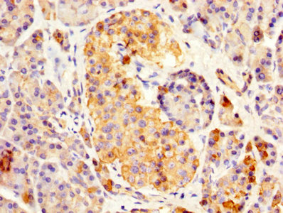 IHC image of CSB-PA019548EA01HU diluted at 1:500 and staining in paraffin-embedded human pancreatic tissue performed on a Leica BondTM system. After dewaxing and hydration, antigen retrieval was mediated by high pressure in a citrate buffer (pH 6.0). Section was blocked with 10% normal goat serum 30min at RT. Then primary antibody (1% BSA) was incubated at 4°C overnight. The primary is detected by a biotinylated secondary antibody and visualized using an HRP conjugated SP system.