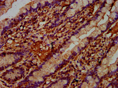 IHC image of CSB-PA887169LA01HU diluted at 1:400 and staining in paraffin-embedded human small intestine tissue performed on a Leica BondTM system. After dewaxing and hydration, antigen retrieval was mediated by high pressure in a citrate buffer (pH 6.0). Section was blocked with 10% normal goat serum 30min at RT. Then primary antibody (1% BSA) was incubated at 4°C overnight. The primary is detected by a biotinylated secondary antibody and visualized using an HRP conjugated SP system.