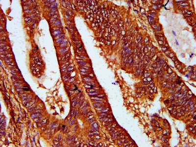 IHC image of CSB-PA887169LA01HU diluted at 1:400 and staining in paraffin-embedded human colon cancer performed on a Leica BondTM system. After dewaxing and hydration, antigen retrieval was mediated by high pressure in a citrate buffer (pH 6.0). Section was blocked with 10% normal goat serum 30min at RT. Then primary antibody (1% BSA) was incubated at 4°C overnight. The primary is detected by a biotinylated secondary antibody and visualized using an HRP conjugated SP system.