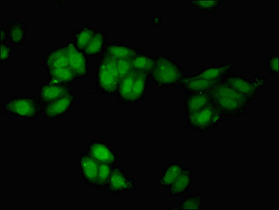Immunofluorescent analysis of HepG2 cells using CSB-PA019571LA01HU at dilution of 1:100 and Alexa Fluor 488-congugated AffiniPure Goat Anti-Rabbit IgG(H+L)