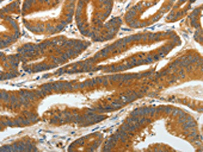 The image on the left is immunohistochemistry of paraffin-embedded Human colon cancer tissue using CSB-PA826561(RGS2 Antibody) at dilution 1/40, on the right is treated with fusion protein. (Original magnification: ×200)