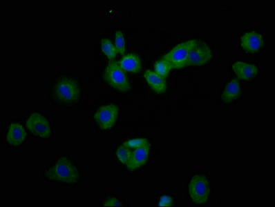 Immunofluorescence staining of HepG2 cells with CSB-PA745331LA01HU at 1:166, counter-stained with DAPI. The cells were fixed in 4% formaldehyde, permeabilized using 0.2% Triton X-100 and blocked in 10% normal Goat Serum. The cells were then incubated with the antibody overnight at 4°C. The secondary antibody was Alexa Fluor 488-congugated AffiniPure Goat Anti-Rabbit IgG(H+L).