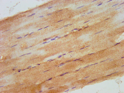 IHC image of CSB-PA745331LA01HU diluted at 1:500 and staining in paraffin-embedded human skeletal muscle tissue performed on a Leica BondTM system. After dewaxing and hydration, antigen retrieval was mediated by high pressure in a citrate buffer (pH 6.0). Section was blocked with 10% normal goat serum 30min at RT. Then primary antibody (1% BSA) was incubated at 4°C overnight. The primary is detected by a biotinylated secondary antibody and visualized using an HRP conjugated SP system.
