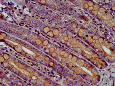 IHC image of CSB-PA745331LA01HU diluted at 1:500 and staining in paraffin-embedded human small intestine tissue performed on a Leica BondTM system. After dewaxing and hydration, antigen retrieval was mediated by high pressure in a citrate buffer (pH 6.0). Section was blocked with 10% normal goat serum 30min at RT. Then primary antibody (1% BSA) was incubated at 4°C overnight. The primary is detected by a biotinylated secondary antibody and visualized using an HRP conjugated SP system.
