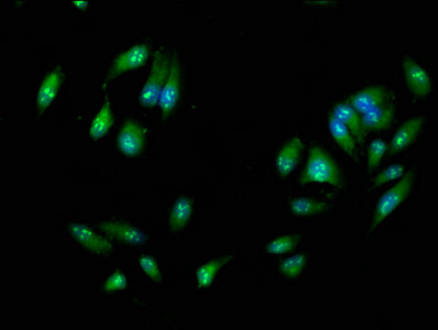 Immunofluorescence staining of Hela cells with CSB-PA897497LA01HU at 1:266, counter-stained with DAPI. The cells were fixed in 4% formaldehyde, permeabilized using 0.2% Triton X-100 and blocked in 10% normal Goat Serum. The cells were then incubated with the antibody overnight at 4°C. The secondary antibody was Alexa Fluor 488-congugated AffiniPure Goat Anti-Rabbit IgG(H+L).