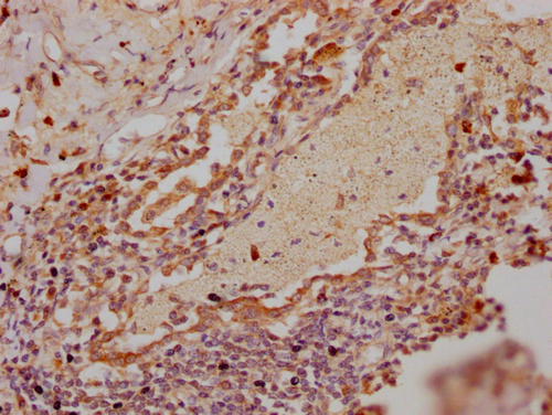 IHC image of CSB-PA019825LA01HU diluted at 1:300 and staining in paraffin-embedded human lung tissue performed on a Leica BondTM system. After dewaxing and hydration, antigen retrieval was mediated by high pressure in a citrate buffer (pH 6.0). Section was blocked with 10% normal goat serum 30min at RT. Then primary antibody (1% BSA) was incubated at 4°C overnight. The primary is detected by a Goat anti-rabbit polymer IgG labeled by HRP and visualized using 0.05% DAB.