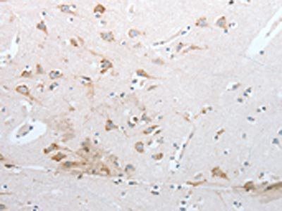 The image on the left is immunohistochemistry of paraffin-embedded Human brain tissue using CSB-PA059841(RNF126 Antibody) at dilution 1/20, on the right is treated with synthetic peptide. (Original magnification: ×200)
