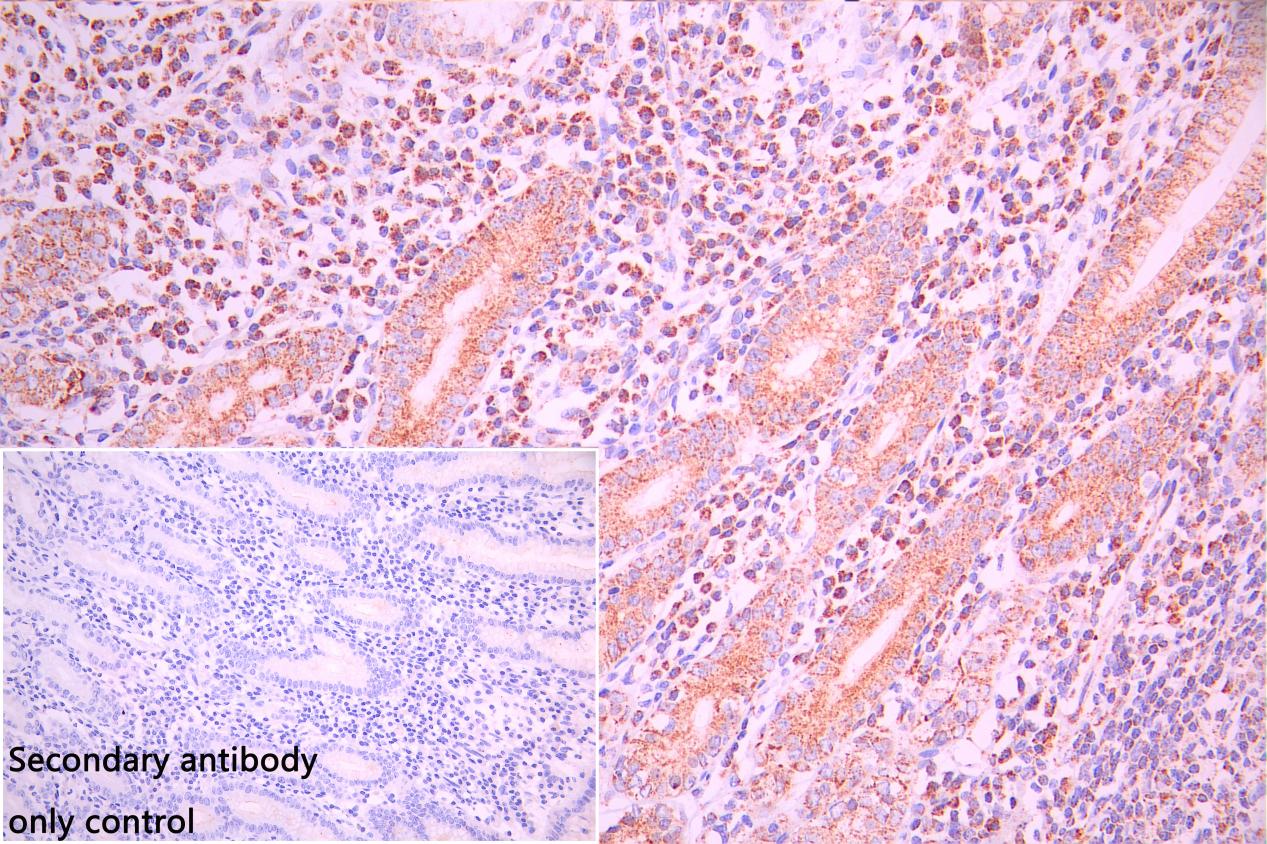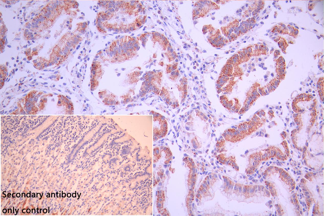 IHC image of CSB-PA811599ESR1HU diluted at 1:100 and staining in paraffin-embedded human stomach tissue performed on a Leica BondTM system. After dewaxing and hydration, antigen retrieval was mediated by high pressure in a citrate buffer (pH 6.0). Section was blocked with 10% normal goat serum 30min at RT. Then primary antibody (1% BSA) was incubated at 4°C overnight. The primary is detected by a Goat anti-rabbit polymer IgG labeled by HRP and visualized using 0.05% DAB. Secondary antibody only control: uses 1% BSA instead of primary antibody