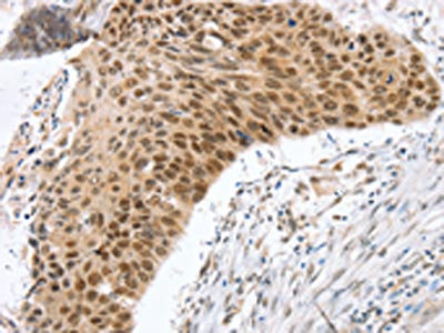 The image on the left is immunohistochemistry of paraffin-embedded Human esophagus cancer tissue using CSB-PA870281(RNF20 Antibody) at dilution 1/25, on the right is treated with fusion protein. (Original magnification: ×200)