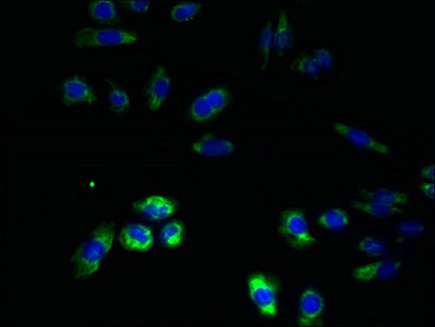 Immunofluorescent analysis of HepG2 cells using CSB-PA019883LA01HU at dilution of 1:100 and Alexa Fluor 488-congugated AffiniPure Goat Anti-Rabbit IgG(H+L)