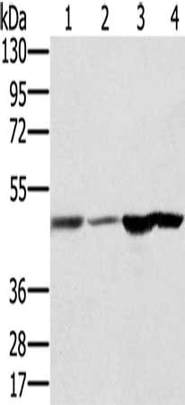Gel: 8%SDS-PAGE, Lysate: 40 μg, Lane 1-4: Human fetal brain tissue, Human normal liver tissue, human normal kidney tissue, hepg2 cells, Primary antibody: CSB-PA904655(RNH1 Antibody) at dilution 1/400, Secondary antibody: Goat anti rabbit IgG at 1/8000 dilution, Exposure time: 10 seconds