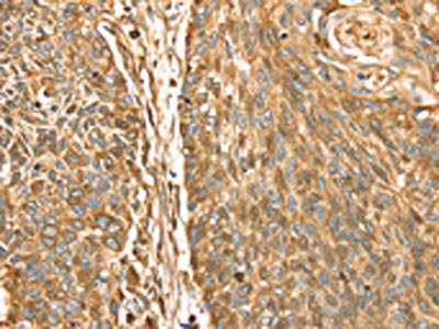 The image on the left is immunohistochemistry of paraffin-embedded Human esophagus cancer tissue using CSB-PA291923(ROBO3 Antibody) at dilution 1/25, on the right is treated with fusion protein. (Original magnification: ×200)