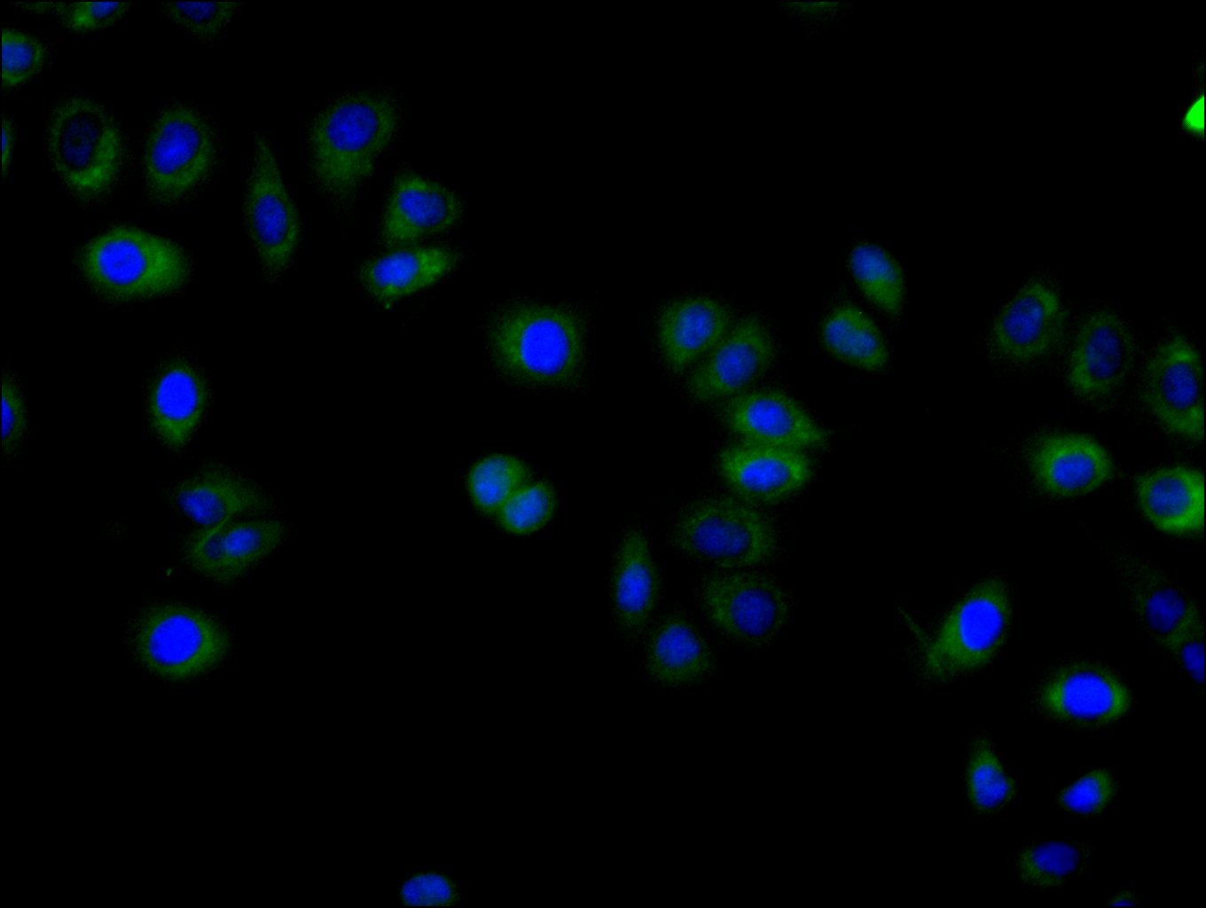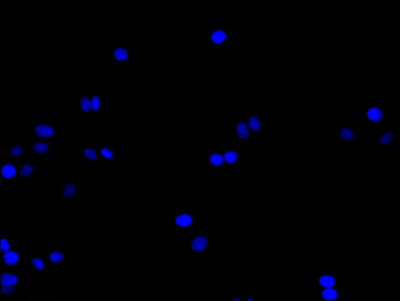 Immunofluorescence staining of Hela cell with CSB-PA624103LA01HU at 1:20, counter-stained with DAPI. The cells were fixed in 4% formaldehyde and blocked in 10% normal Goat Serum. The cells were then incubated with the antibody overnight at 4C. The secondary antibody was Alexa Fluor 488-congugated AffiniPure Goat Anti-Rabbit IgG(H+L).