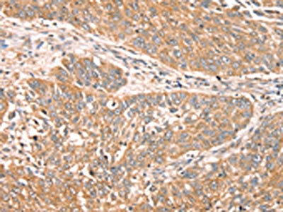 The image on the left is immunohistochemistry of paraffin-embedded Human lung cancer tissue using CSB-PA121989(RPS6KA1 Antibody) at dilution 1/30, on the right is treated with fusion protein. (Original magnification: ×200)