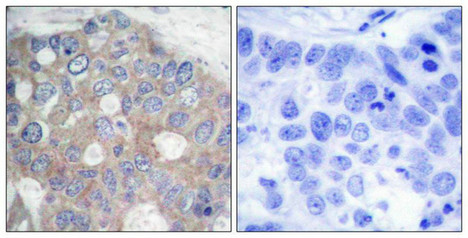 Immunohistochemical analysis of paraffin-embedded human breast carcinoma tissue using p70 S6 Kinase(Ab-421) Antibody(left) or the same antibody preincubated with blocking peptide(right).