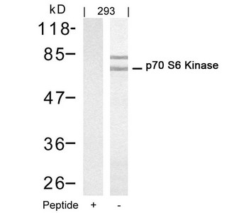 Western blot analysis of extracts from 293 cells using p70 S6 Kinase(Ab-421) Antibody(Lane 2) and the same antibody preincubated with blocking peptide(Lane1).