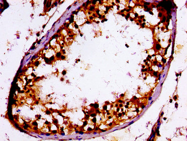 IHC image of CSB-PA020476LA01HU diluted at 1:100 and staining in paraffin-embedded human testis tissue performed on a Leica BondTM system. After dewaxing and hydration, antigen retrieval was mediated by high pressure in a citrate buffer (pH 6.0). Section was blocked with 10% normal goat serum 30min at RT. Then primary antibody (1% BSA) was incubated at 4°C overnight. The primary is detected by a biotinylated secondary antibody and visualized using an HRP conjugated ABC system.