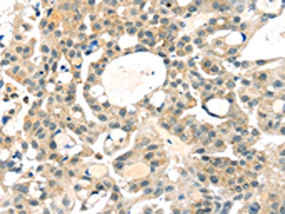 The image on the left is immunohistochemistry of paraffin-embedded Human breast cancer tissue using CSB-PA071515(RRAGA Antibody) at dilution 1/25, on the right is treated with fusion protein. (Original magnification: ×200)