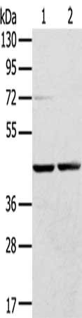 Gel: 8%SDS-PAGE, Lysate: 40 μg, Lane 1-2: Hepg2 cells, hela cells, Primary antibody: CSB-PA071515(RRAGA Antibody) at dilution 1/400, Secondary antibody: Goat anti rabbit IgG at 1/8000 dilution, Exposure time: 3 seconds