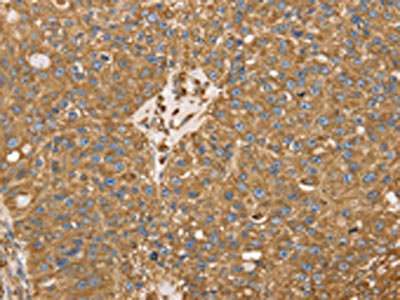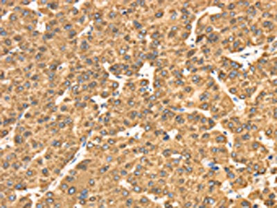 The image on the left is immunohistochemistry of paraffin-embedded Human liver cancer tissue using CSB-PA083779(RRBP1 Antibody) at dilution 1/25, on the right is treated with fusion protein. (Original magnification: ×200)