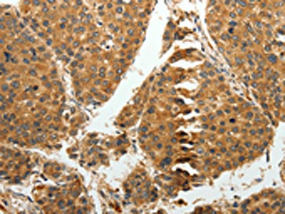 The image on the left is immunohistochemistry of paraffin-embedded Human liver cancer tissue using CSB-PA578648(RRM1 Antibody) at dilution 1/15, on the right is treated with fusion protein. (Original magnification: ×200)