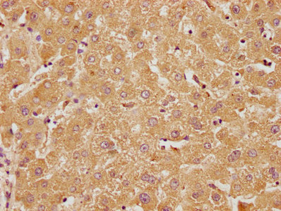 IHC image of CSB-PA774805NA01HU diluted at 1:100 and staining in paraffin-embedded human liver tissue performed on a Leica BondTM system. After dewaxing and hydration, antigen retrieval was mediated by high pressure in a citrate buffer (pH 6.0). Section was blocked with 10% normal goat serum 30min at RT. Then primary antibody (1% BSA) was incubated at 4°C overnight. The primary is detected by a biotinylated secondary antibody and visualized using an HRP conjugated SP system.