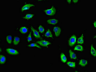 Immunofluorescent analysis of A549 cells using CSB-PA867132LA01HU at dilution of 1:100 and Alexa Fluor 488-congugated AffiniPure Goat Anti-Rabbit IgG(H+L)