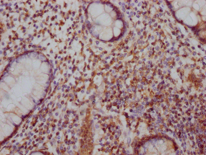 IHC image of CSB-PA892170LA01HU diluted at 1:100 and staining in paraffin-embedded human colon cancer performed on a Leica BondTM system. After dewaxing and hydration, antigen retrieval was mediated by high pressure in a citrate buffer (pH 6.0). Section was blocked with 10% normal goat serum 30min at RT. Then primary antibody (1% BSA) was incubated at 4°C overnight. The primary is detected by a Goat anti-rabbit IgG labeled by HRP and visualized using 0.05% DAB.