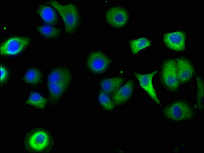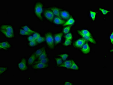 Immunofluorescence staining of HepG2 cells with CSB-PA020731LA01HU at 1:100, counter-stained with DAPI. The cells were fixed in 4% formaldehyde, permeabilized using 0.2% Triton X-100 and blocked in 10% normal Goat Serum. The cells were then incubated with the antibody overnight at 4°C. The secondary antibody was Alexa Fluor 488-congugated AffiniPure Goat Anti-Rabbit IgG(H+L).