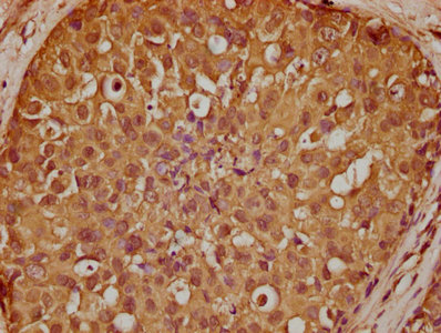 IHC image of CSB-PA020731LA01HU diluted at 1:200 and staining in paraffin-embedded human breast cancer performed on a Leica BondTM system. After dewaxing and hydration, antigen retrieval was mediated by high pressure in a citrate buffer (pH 6.0). Section was blocked with 10% normal goat serum 30min at RT. Then primary antibody (1% BSA) was incubated at 4°C overnight. The primary is detected by a biotinylated secondary antibody and visualized using an HRP conjugated SP system.