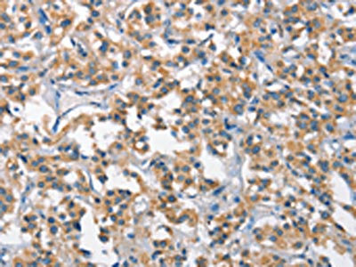 The image on the left is immunohistochemistry of paraffin-embedded Human thyroid cancer tissue using CSB-PA886284(SCARB1 Antibody) at dilution 1/65, on the right is treated with fusion protein. (Original magnification: ×200)