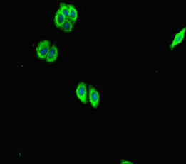 Immunofluorescent analysis of HepG2 cells using CSB-PA020808LA01HU at dilution of 1:100 and Alexa Fluor 488-congugated AffiniPure Goat Anti-Rabbit IgG(H+L)