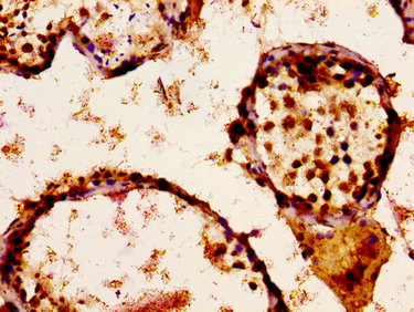 IHC image of CSB-PA613605LA01HU diluted at 1:300 and staining in paraffin-embedded human testis tissue performed on a Leica BondTM system. After dewaxing and hydration, antigen retrieval was mediated by high pressure in a citrate buffer (pH 6.0). Section was blocked with 10% normal goat serum 30min at RT. Then primary antibody (1% BSA) was incubated at 4°C overnight. The primary is detected by a biotinylated secondary antibody and visualized using an HRP conjugated ABC system.