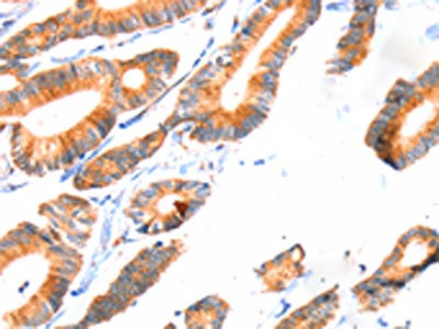 The image on the left is immunohistochemistry of paraffin-embedded Human colon cancer tissue using CSB-PA435775(SCNN1A Antibody) at dilution 1/30, on the right is treated with synthetic peptide. (Original magnification: ×200)