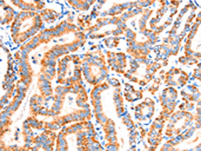 The image on the left is immunohistochemistry of paraffin-embedded Human thyroid cancer tissue using CSB-PA435775(SCNN1A Antibody) at dilution 1/30, on the right is treated with synthetic peptide. (Original magnification: ×200)
